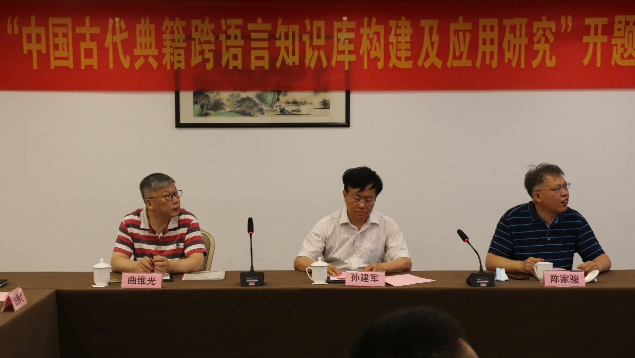 院长孙建军教授担任专家组组长。项目首席专家王东波教授首先就课题的研究概念和背景、研究设想、项目主要研究内容、子课题设计、研究目标、研究视角、研究路径、技术路线、关键问题、重点难点以及创新特色、计划成果等向与会专家进行了详细汇报。王东波教授表示,中国古代典籍在塑造中华民族独有的个性和民族身份感历程中扮演了极为重要的角色,把中国古代典籍中蕴含的思想、文化、知识和智慧通过有效的方式与手段向世界推广与传播,是加深世界对中国的了解、实现中外文化更好交流的重要途径。课题将选择已有对应的公开出版的英、法、德、西班牙、俄语及现代汉语译本的中国古代典籍,完成自动分词、词性标注、实体标注、句法标注、章节对齐、段落对齐、句子对齐、实体对齐等研究任务,训练相关传统机器学习和深度学习模型,并基于词汇、词性、实体和句法等多维度的知识构建中国古代典籍跨语言知识库并进而开展相关应用研究。