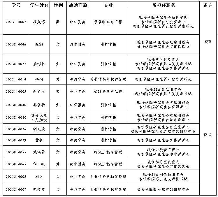 根据《性爱片 研究生奖助体系实施方案》(校研发〔2021〕175号)文件精神,经个人申请、学院评审等环节,现将2023-2024学年性爱片 优秀研究生干部拟推荐名单公示如下: