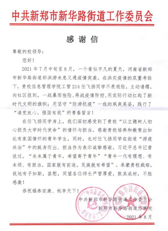 工程214班任飞扬同学不畏艰险,主动请缨,向社区报到,一战暴雨抢险,再战疫情防控,用实际行动扛起了新时代文明的旗帜,用坚守“防洪抗疫”一线的飒爽英姿,践行了“请党放心,强国有我”的青春誓言。