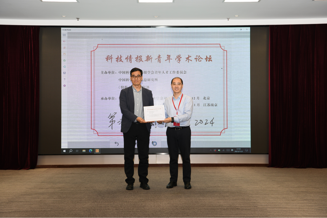 我院杨波教授主持大会闭幕式,并感谢了所有与会代表,对此次论坛做了客观详实的总结和点评,宣布下一届科技情报新青年学术论坛将由中国人民大学信息资源管理学院承办,并与闫慧教授进行交接仪式。