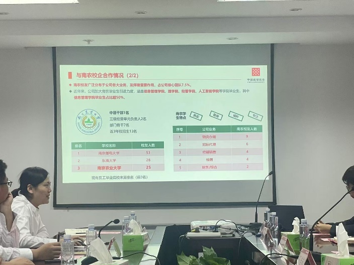江苏中博通信有限公司第七党支部书记、团委书记、人力资源部主任李婷介绍公司发展概况、第七党支部概况、与南农校企合作情况、校企合作展望等情况,重点介绍了公司的核心业务能力、支部党建品牌以及产学研合作情况中当前企业的发展痛点和南农学子在企业就职情况等,并积极展望了校企之间未来的合作交流。