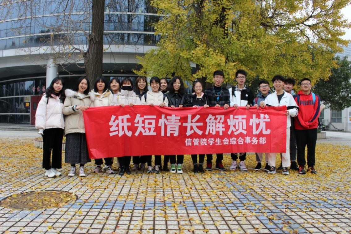 学生会办公室处,同时领取他人的信封进行解答。在为期三天的时间里,同学们可对他人的问题进行解答。解答完成后,综合事务部工作人员组织参加生活类的同学们交换取回自己的信封,并以QQ官方号的形式发表优秀学长学姐们对有代表性的学习类问题的解答,至此活动圆满结束。