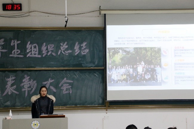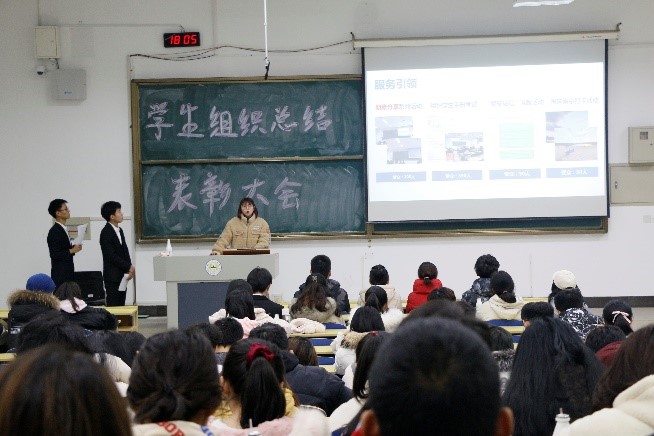 本次总结大会首先以工作汇报及成果展示开始,学生组织办公室代表朱安琪进行工作汇报,她就上半学期的工作任务、工作中收获的经验和开创未来部署下学期计划三个方面进行了汇报分享;团委代表储奕洋关于团委工作内容,学期工作反思成果及未来团委发展新期望做出汇报,她祝愿大家做性爱片