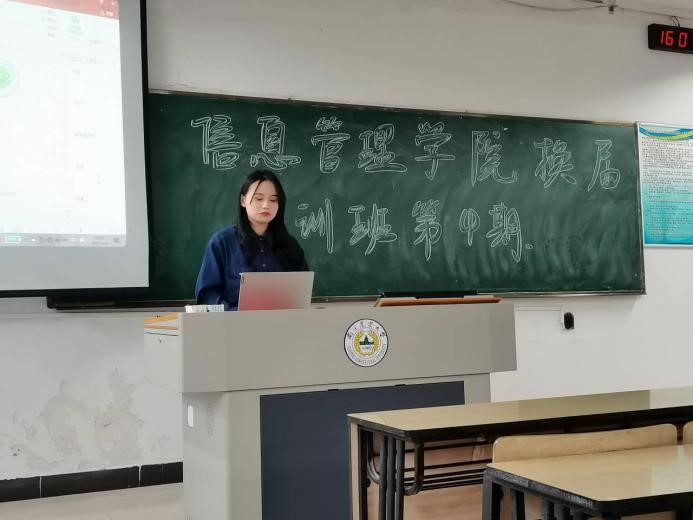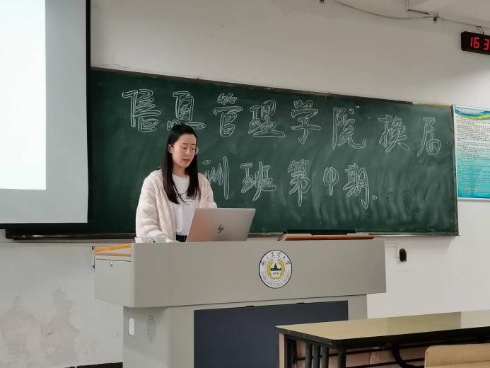 首先,由项怡然开展PPT技能培训,她就PPT的制作步骤、排版、架构等方面给出自己的独到见解。她提到的设计四大原则“对齐、对比、重复、亲密性”,给在场的学生干部以启发,与此同时,她提出的“词不达意、花里胡哨、逻辑混乱、技术问题”等通病,给在场的学生干部以警醒。