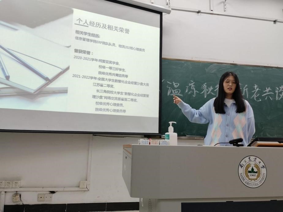 第二位进行经验分享的是付杰,她以物流专业在大一期间的学习为主题,将大一的学习重点分为上学期和下学期两部分,并对各位新生提出学习建议,她提出在期末面对多门课程需要复习时,要明确复习计划,切忌方向不明。最后,作为心理委员的她以班级心理剧照为例向新生们展示了丰富多彩的大学生活并鼓励大一新生们跳出舒适圈,敢于尝试、突破自我,做到文体两开花。