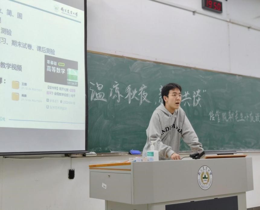 紧接着,谢佳宏走上讲台,他针对信息管理与信息系统专业的学习分享了自己的学习心得。他建议在学习微积分的过程中可以多在B站或贴吧等平台寻找对自己有用的学习视频或学习资料。同时他希望大一新生们多通过各种渠道去了解学科竞赛,通过竞赛充实自己的大学生活,并从中得到锻炼。最后,他建议大家培养自我学习的观念,并根据自己的目标制定适当的方案。