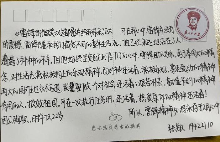 王一帆同学写道:“对待同志要像春天般的温暖,对待工作要像夏天一样火热,对待个人主义要像秋风扫落叶一样,对待敌人要像严冬一样残酷无情。”雷锋精神的本质不就是这种热爱祖国,把国家和人民的利益放在第一位,只讲奉献,不讲索取,全心全意为人民服务的奉献精神。