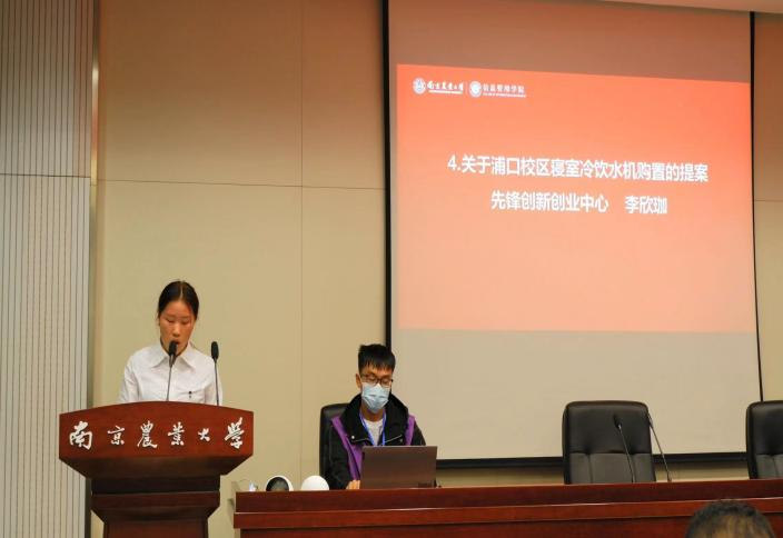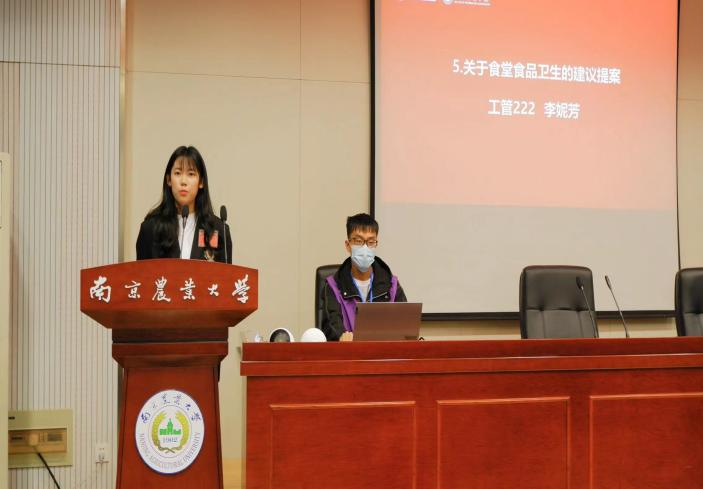 随后,各位代表就所写提案向大会做了宣讲。因事、因病请假的代表由综合事务部工作人员代为宣讲。各位代表各抒己见,畅所欲言,其中,先锋创新创业中心李欣珈代表的《关于浦口校区寝室冷饮水机置购的提案》、工程212王玉婷代表《关于宿舍安全和卫生的建议提案》等提案得到大会的一致通过。