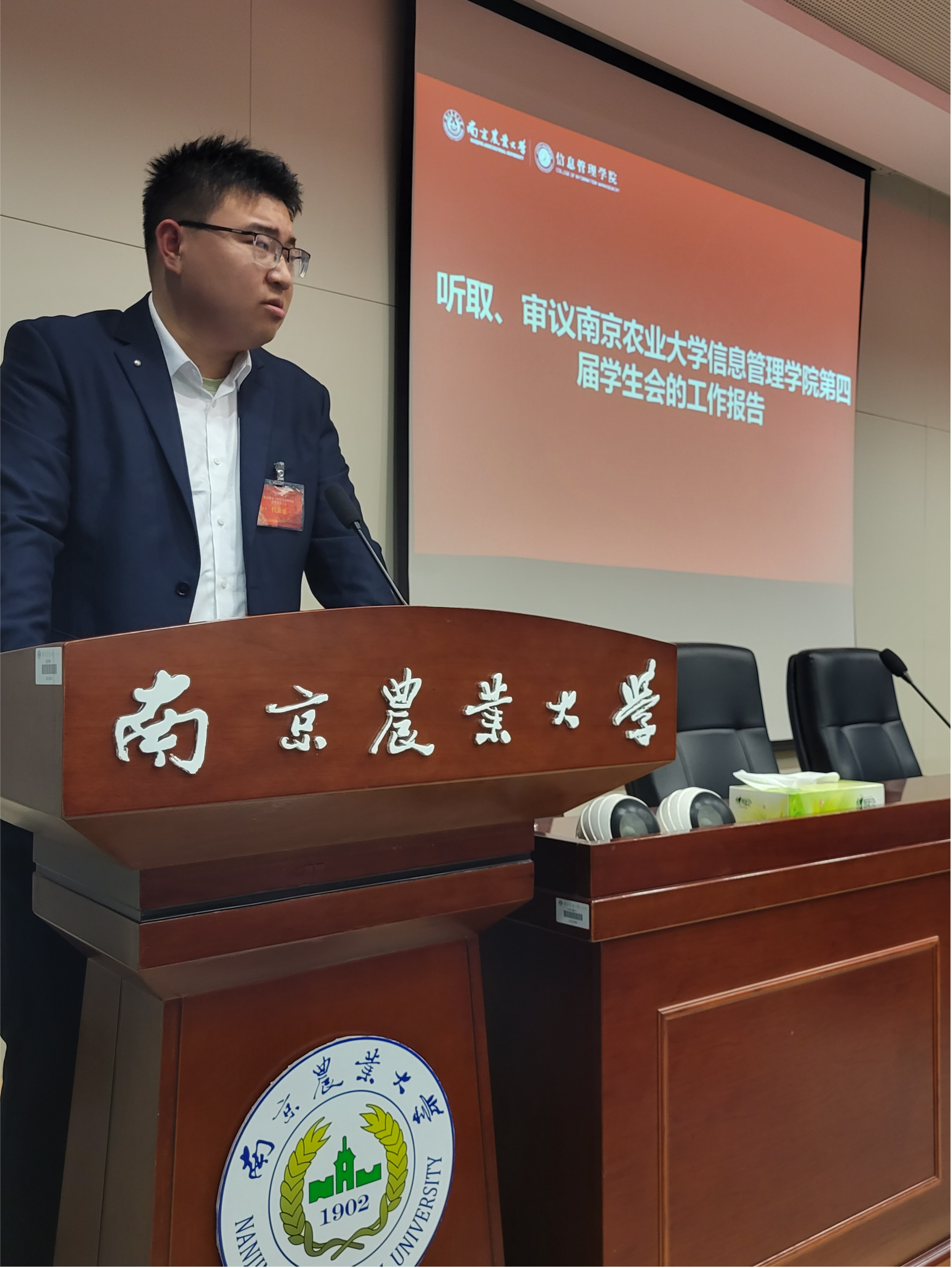 第四届学生会夏鑫楠主席从组织架构、组织建设、活动开展三方面做任期工作报告,指出要赓续“从同学中来到同学中去”的光荣传统和坚持“全心全意为同学服务”的根本宗旨,并最后作出总结展望。