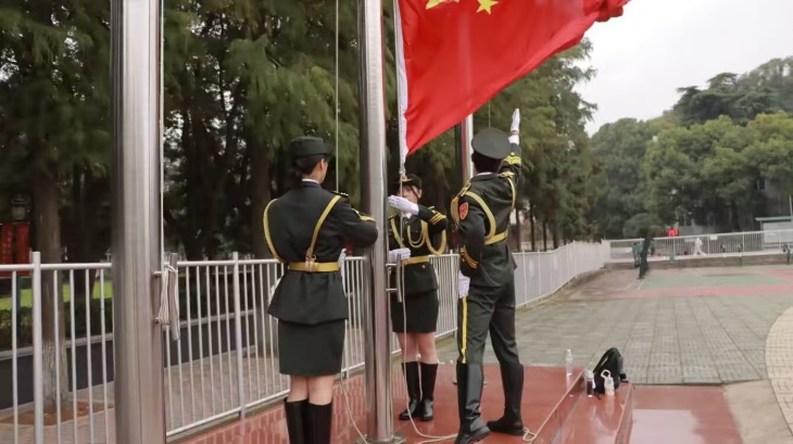 升国旗、奏国歌 国旗护卫队迈着整齐的步伐行进