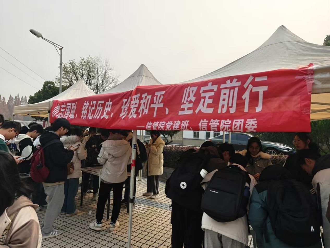 在广场的一角,一张张有关南京大屠杀的史料图片被展露在阳光下,工作人员们对图片详细讲解,同学们怀着悲痛的心情了解后,纷纷扫码进行“南京大屠杀”史实线上随机提问活动,通过“云上”问答,同学们加深对这段历史的认识与理解,一同致敬历史、崇尚和平。